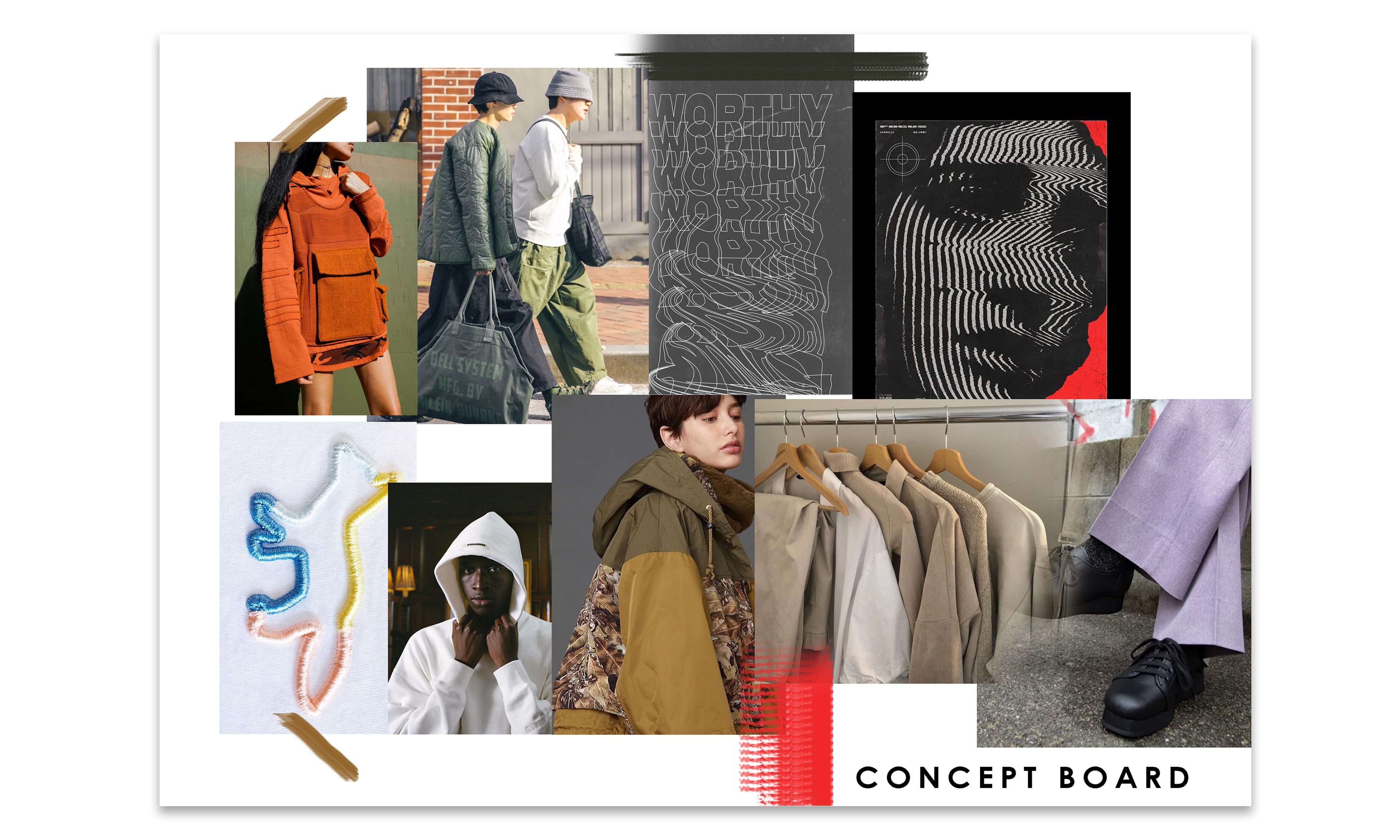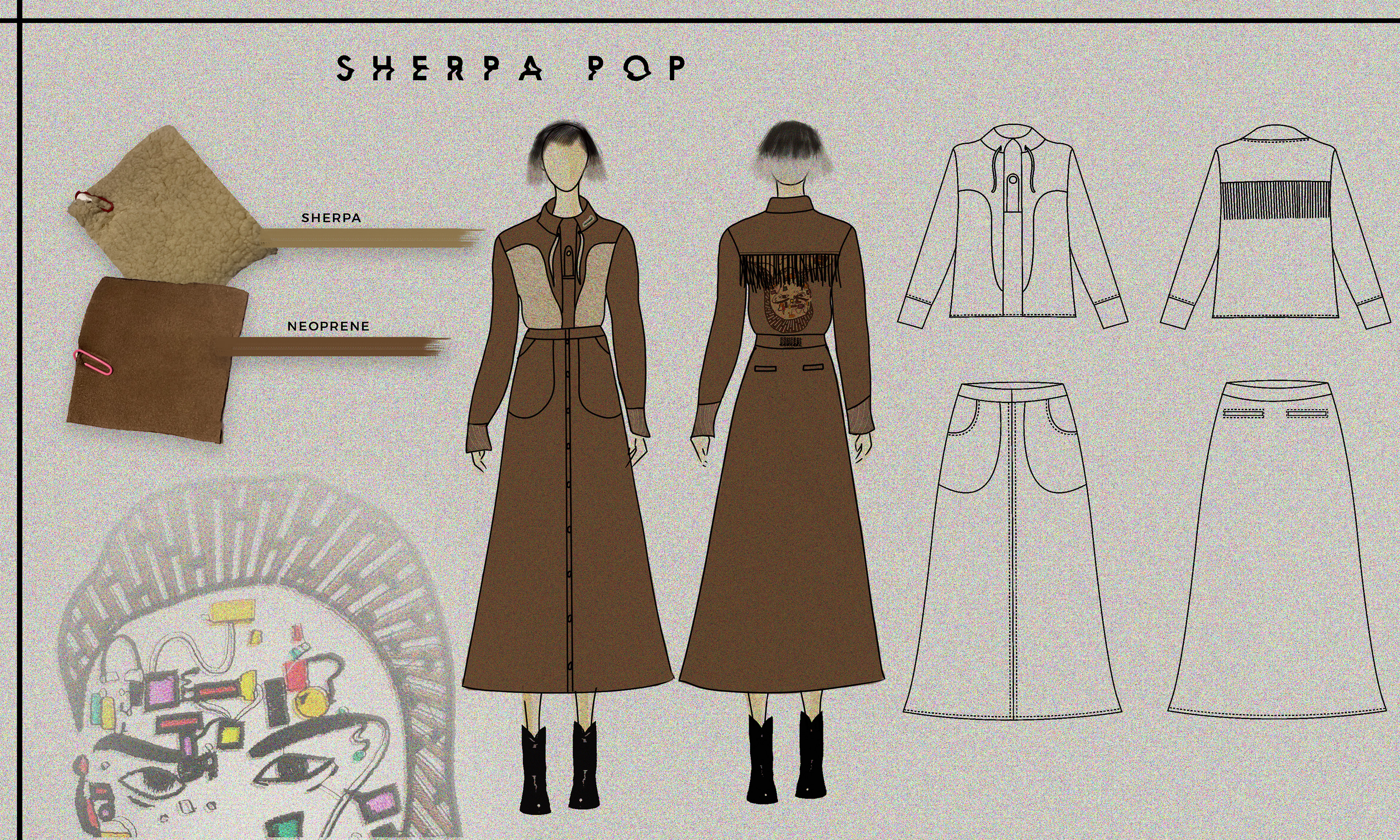 1 of the 6 garment which I was able to complete. There are stitch lines which depicts frequencies as the concept of the project with embroidered artwork on pockets and screen printed cuffs.